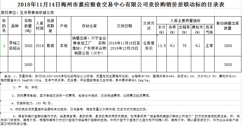 受客戶委托,梅州市嘉應糧食交易中心有限公司定于2018年11月14日(星期三)舉辦稻谷購銷價差聯(lián)動標的交易會,五華縣糧食收儲公司擬銷售和采購早秈稻3000噸。