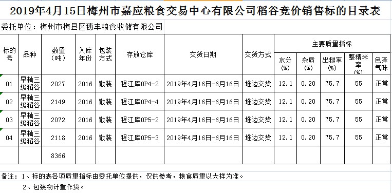 受客戶委托,梅州市嘉應(yīng)糧食交易中心有限公司定于2019年4月15日(星期一)舉辦糧食競價(jià)交易會(huì),梅州市梅縣區(qū)穗豐糧食收儲(chǔ)有限公司擬銷售2016年早秈稻8366噸。