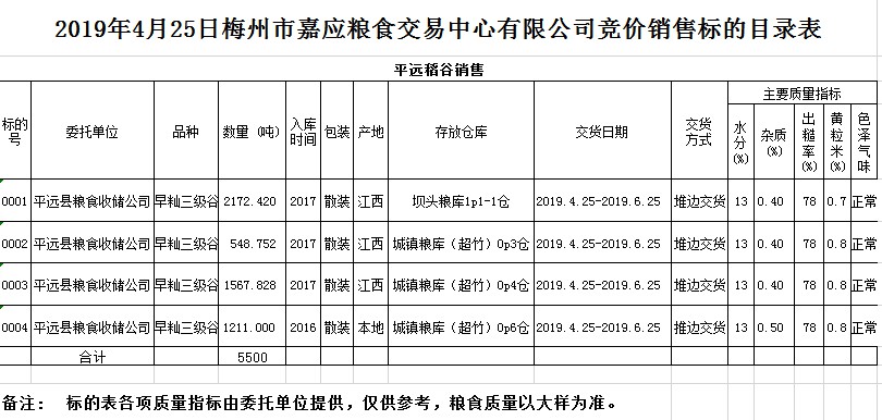 受客戶委托,梅州市嘉應(yīng)糧食交易中心有限公司定于2019年4月25日(星期四)舉辦糧食競(jìng)價(jià)交易會(huì),平遠(yuǎn)縣糧食收儲(chǔ)公司擬銷售2016年早秈稻1211噸,2017年早秈稻4289噸。