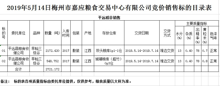 受客戶委托,梅州市嘉應(yīng)糧食交易中心有限公司定于2019年5月14日(星期二)舉辦糧食競(jìng)價(jià)交易會(huì),平遠(yuǎn)縣糧食收儲(chǔ)公司擬銷售2017年早秈稻2721.172噸。