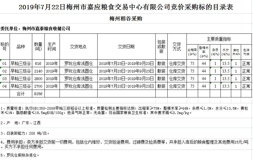 2019年7月22日梅州市嘉泰糧食收儲公司稻谷采購