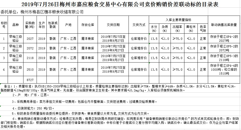 受客戶(hù)委托,梅州市嘉應(yīng)糧食交易中心有限公司定于2019年7月26日(星期五)舉辦稻谷購(gòu)銷(xiāo)價(jià)差聯(lián)動(dòng)標(biāo)的交易會(huì),梅州市梅縣區(qū)穗豐糧食收儲(chǔ)有限公司擬銷(xiāo)售和采購(gòu)早秈稻8727噸。