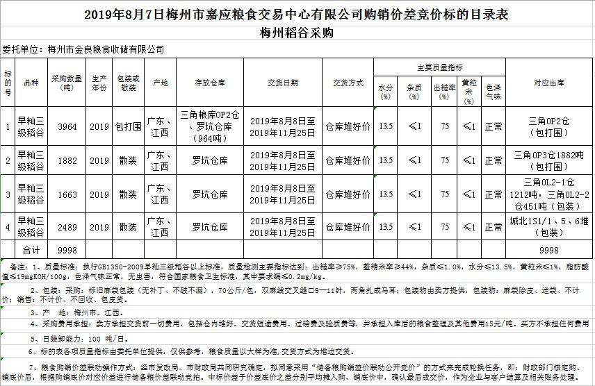 受客戶委托,梅州市嘉應(yīng)糧食交易中心有限公司定于2019年8月7日(星期三)舉辦稻谷購銷價差聯(lián)動標(biāo)的交易會,梅州市金良糧食收儲有限公司擬銷售和采購早秈稻9998噸。