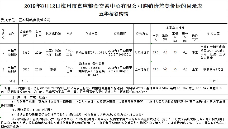 受客戶委托,梅州市嘉應(yīng)糧食交易中心有限公司定于2019年8月12日(星期一)舉辦稻谷購(gòu)銷(xiāo)價(jià)差聯(lián)動(dòng)標(biāo)的交易會(huì),廣東省五華縣糧食收儲(chǔ)公司擬銷(xiāo)售和采購(gòu)早秈稻13170噸。