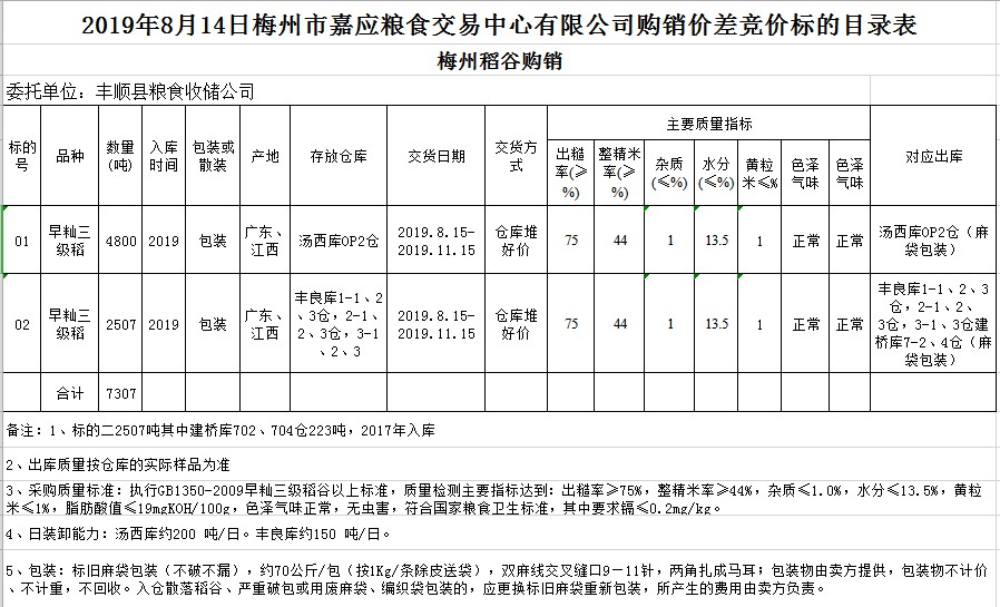 受客戶委托,梅州市嘉應糧食交易中心有限公司定于2019年8月14日(星期三)舉辦稻谷購銷價差聯(lián)動標的交易會,豐順縣糧食收儲公司擬銷售和采購早秈稻7307噸。