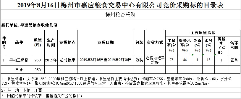 受客戶委托,梅州市嘉應糧食交易中心有限公司定于2019年8月16日(星期五)舉辦糧食競價交易會,平遠縣糧食收儲公司擬采購2019年早秈稻950噸。