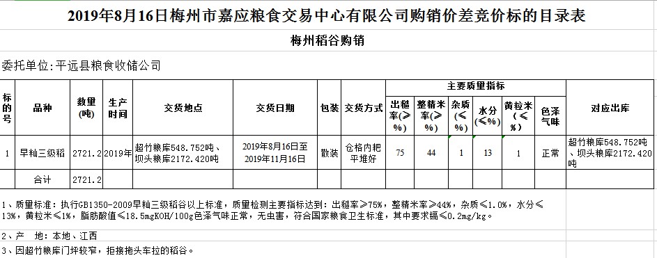 受客戶委托,梅州市嘉應(yīng)糧食交易中心有限公司定于2019年8月16日(星期五)舉辦稻谷購(gòu)銷價(jià)差聯(lián)動(dòng)標(biāo)的交易會(huì),平遠(yuǎn)縣糧食收儲(chǔ)公司擬銷售和采購(gòu)早秈稻2721.2噸。