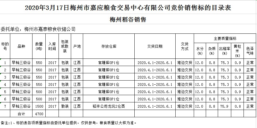 受客戶委托,梅州市嘉應(yīng)糧食交易中心有限公司定于2020年3月17日(星期二)舉辦糧食競(jìng)價(jià)交易會(huì),梅州市嘉泰糧食收儲(chǔ)公司擬銷(xiāo)售2017年早秈稻4700噸。
