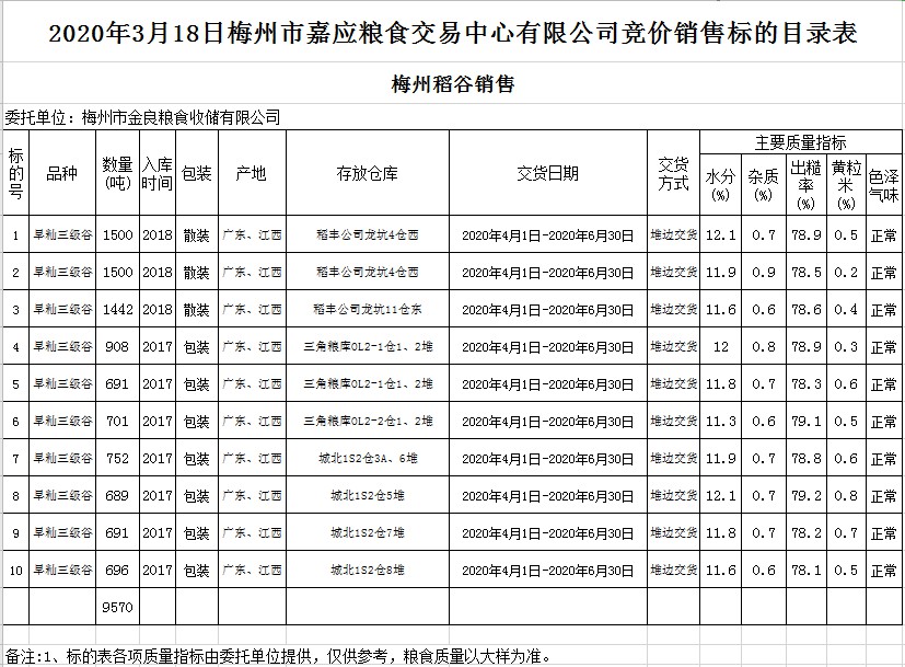 受客戶委托,梅州市嘉應(yīng)糧食交易中心有限公司定于2020年3月18日(星期三)舉辦糧食競價交易會,梅州市金良糧食收儲有限公司擬銷售2017年、2018年早秈稻9570噸。
