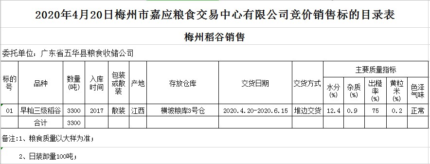 受客戶委托,梅州市嘉應(yīng)糧食交易中心有限公司定于2020年4月20日(星期一)舉辦糧食競價(jià)交易會(huì),廣東省五華縣糧食收儲(chǔ)公司擬銷售2017年早秈稻3300噸。
