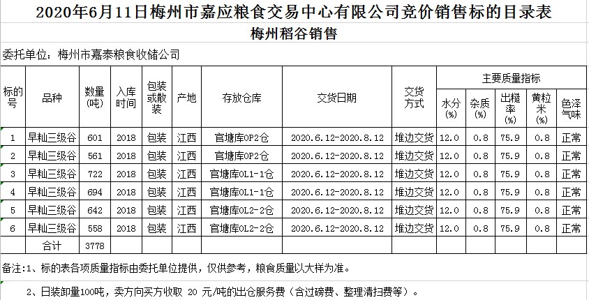 受客戶委托,梅州市嘉應糧食交易中心有限公司定于2020年6月11日(星期四)舉辦糧食競價交易會,梅州市嘉泰糧食收儲公司擬銷售2018年早秈稻3778噸。