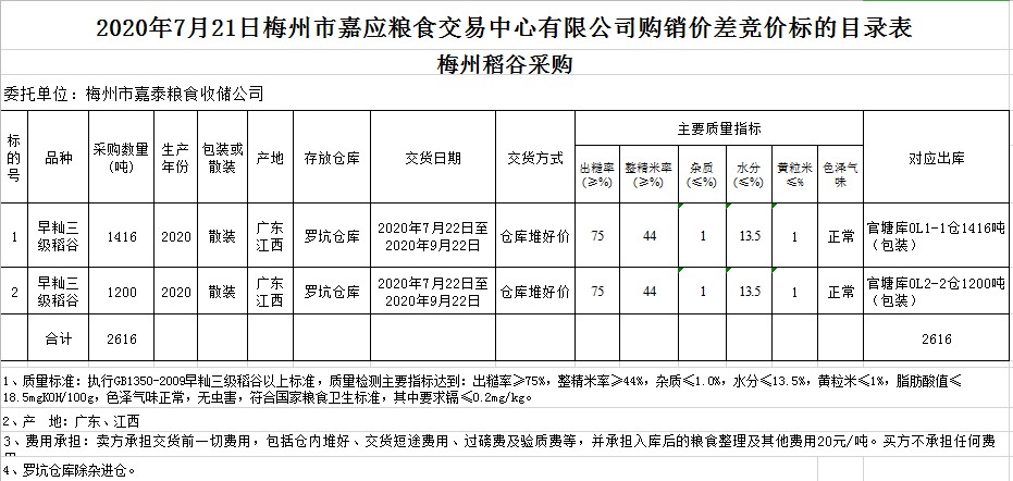 受客戶委托,梅州市嘉應(yīng)糧食交易中心有限公司定于2020年7月21日(星期二)舉辦稻谷購銷價差聯(lián)動標的交易會,梅州市嘉泰糧食收儲公司擬銷售和采購早秈稻2616噸。
