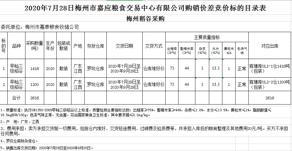 受客戶委托,梅州市嘉應糧食交易中心有限公司定于2020年7月28日(星期二)舉辦稻谷購銷價差聯(lián)動標的交易會,梅州市嘉泰糧食收儲公司擬銷售和采購早秈稻2616噸。