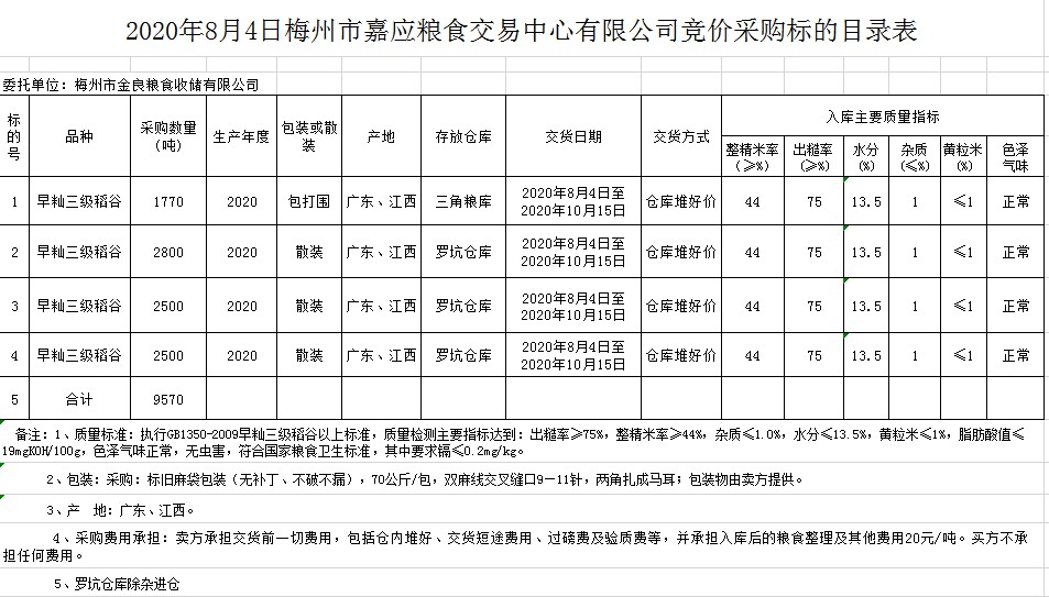 受客戶委托,梅州市嘉應(yīng)糧食交易中心有限公司定于2020年8月4日(星期二)舉辦糧食競價交易會,梅州市金良糧食收儲有限公司擬采購2020年早秈稻9570噸。