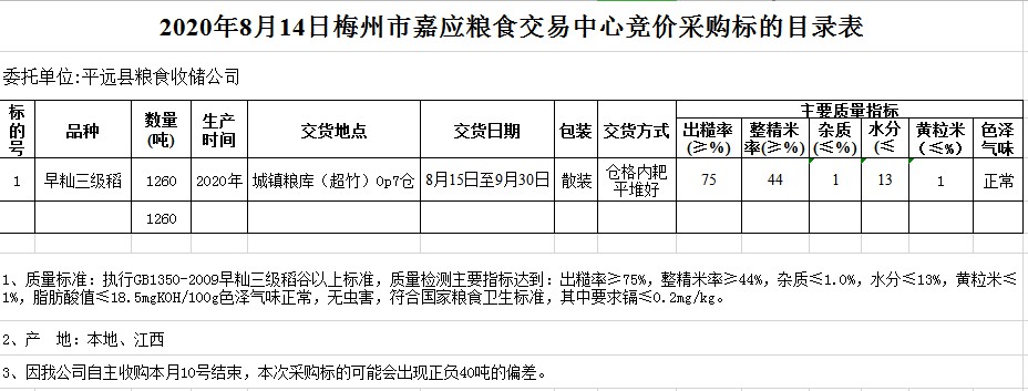 受客戶委托,梅州市嘉應糧食交易中心有限公司定于2020年8月14日(星期五)舉辦糧食競價交易會,平遠縣糧食收儲公司擬采購2020年早秈稻1260噸。
