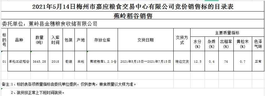 受客戶委托,梅州市嘉應(yīng)糧食交易中心有限公司定于2021年5月14日(星期五)舉辦糧食競價交易會。蕉嶺縣金穗糧食收儲有限公司擬銷售2018年早秈稻3645.28噸。