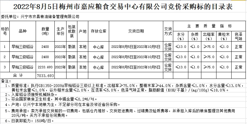 受客戶委托,梅州市嘉應(yīng)糧食交易中心有限公司定于2022年8月5日(星期五)舉辦糧食競價(jià)交易會(huì)。興寧市齊昌糧油儲(chǔ)備管理有限公司擬采購2022年早秈稻7033.693噸。