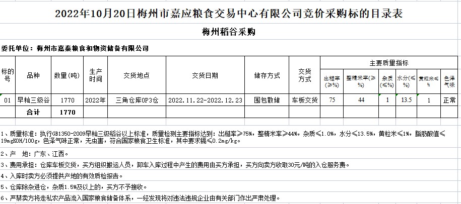 受客戶委托,梅州市嘉應(yīng)糧食交易中心有限公司定于2022年10月20日(星期四)舉辦糧食競(jìng)價(jià)交易會(huì)。梅州市嘉泰糧食和物資儲(chǔ)備有限公司擬采購(gòu)2022年早秈稻1770噸。