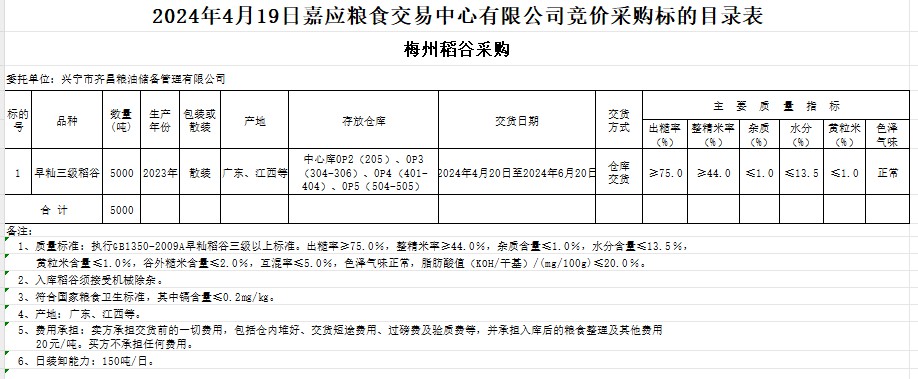受客戶委托,梅州市嘉應(yīng)糧食交易中心有限公司定于2024年4月19日(星期五)舉辦糧食競價(jià)交易會(huì)。興寧市齊昌糧油儲(chǔ)備管理有限公司擬采購2023年產(chǎn)早秈稻5000噸。