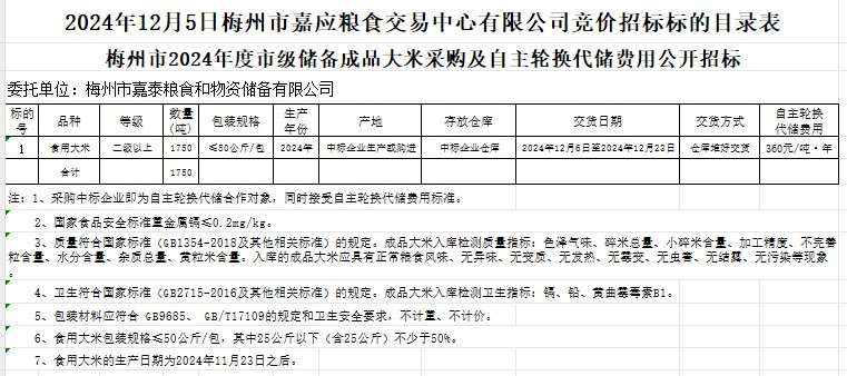 梅州市2024年度市級儲備成品大米采購及自主輪換代儲費用公開招標公告