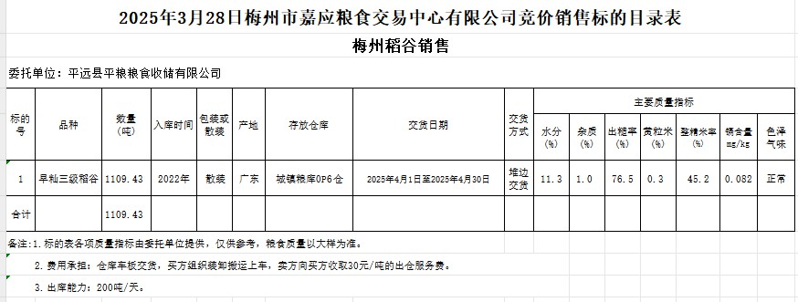 受客戶委托,梅州市嘉應(yīng)糧食交易中心有限公司定于2025年3月28日(星期五)舉辦糧食競(jìng)價(jià)交易會(huì)。平遠(yuǎn)縣平糧糧食收儲(chǔ)有限公司擬銷售2022年產(chǎn)早秈稻1109.43噸。