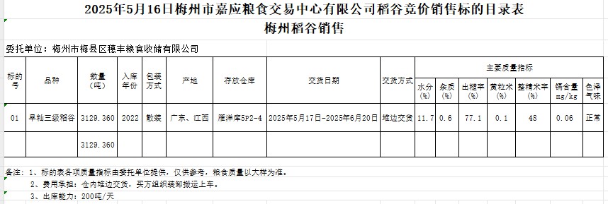 受客戶委托,梅州市嘉應(yīng)糧食交易中心有限公司定于2025年5月16日(星期五)舉辦糧食競(jìng)價(jià)交易會(huì)。梅州市梅縣區(qū)穗豐糧食收儲(chǔ)有限公司擬銷售2022年產(chǎn)早秈稻谷3129.360噸。