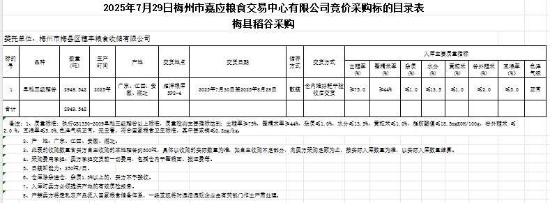 受客戶委托,梅州市嘉應(yīng)糧食交易中心有限公司定于2025年7月29日(星期二)舉辦糧食競價(jià)交易會(huì)。梅州市梅縣區(qū)穗豐糧食收儲(chǔ)有限公司擬采購2025年產(chǎn)早秈稻谷2949.542噸。