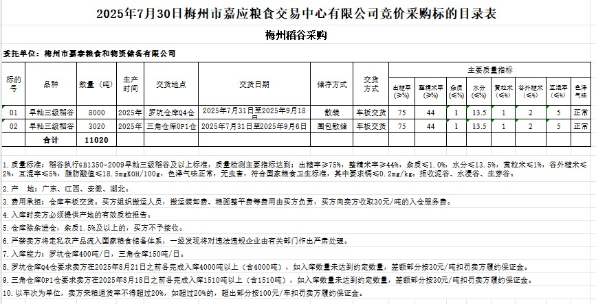 受客戶委托,梅州市嘉應(yīng)糧食交易中心有限公司定于2025年7月30日(星期三)舉辦糧食競(jìng)價(jià)交易會(huì)。梅州市嘉泰糧食和物資儲(chǔ)備有限公司擬采購(gòu)2025年產(chǎn)早秈稻谷11020噸。