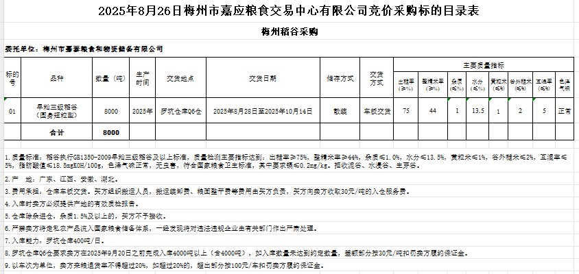 受客戶委托,梅州市嘉應(yīng)糧食交易中心有限公司定于2025年8月26日(星期二)舉辦糧食競價交易會。梅州市嘉泰糧食和物資儲備有限公司擬采購2025年產(chǎn)早秈稻谷8000噸。