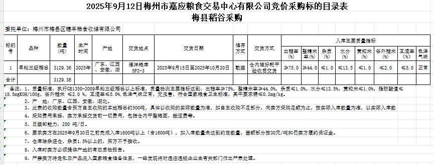 受客戶委托,梅州市嘉應糧食交易中心有限公司定于2025年9月12日(星期五)舉辦糧食競價交易會。梅州市梅縣區(qū)穗豐糧食收儲有限公司擬采購2025年產早秈稻谷3129.36噸。